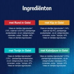 Felix Elke Dag Feest is een assortiment onweerstaanbare maaltijden die er zó lekker uitzien, zó lekker ruiken en zó lekker smaken alsof je het zelf hebt klaargemaakt! Speciaal bereid met zachte stukjes in een overheerlijke gelei. Jouw deugniet zal elke keer weer genieten van een onweerstaanbare maaltijd. Deze heerlijke maaltijden vormen ook een bron van essentiële omega 6-vetzuren met de juiste combinatie van uitgebalanceerde vitaminen die jouw kat energie zullen geven en klaar zullen maken om nog meer kattenkwaad uit te halen. Ze zitten vol gezonde ingrediënten om 100% te voldoen aan de behoeften van jouw kat indien gevoed volgens de voedingsrichtlijnen op de verpakking. FELIX – gewoonweg onweerstaanbaar!