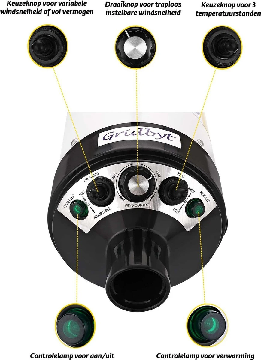 - Luchtsnelheid traploos instelbaar van 25 m/s tot wel 50 m/s.