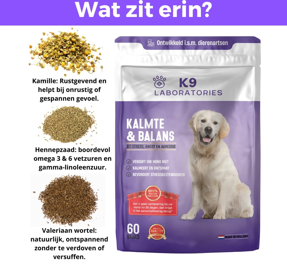 anti-stress hond – supplement hond – hondensupplement – angstige hond – bange hond – agressieve hond – angst en stress – dierenartsbezoek honden – lawaai hond – reizen met hond – kalmering hond – rustige honden – reduceert agressie – voedingssupplement voor honden – valeriaan wortel – sint jans kruid hond – valeriaan hond – balans hond – hennepzaad hond – hennepolie hond – L-tryptofaan – kalme hond – verdooft niet – angstgevoelens hond – angst hond – kalmeert hond – nerveuze hond – kalmerend voor honden