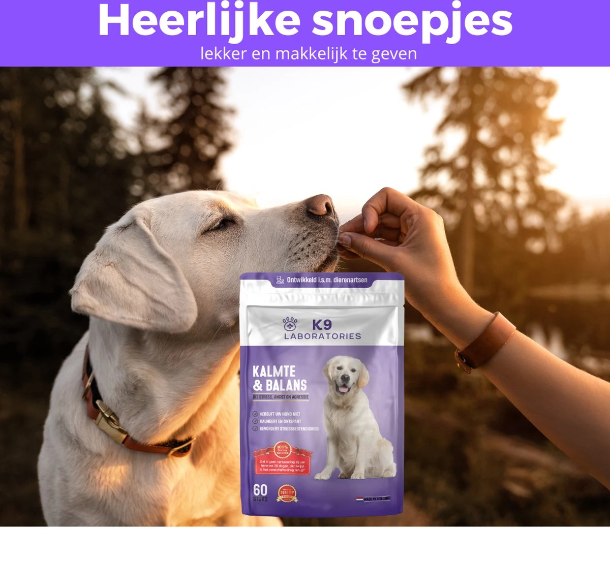 K9 Laboratories Kalmte & balans 60 stuks. Voedingssupplement als snackje voor honden bij angst, stress, nervositeit of agressie.