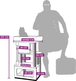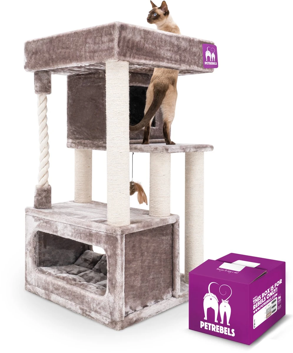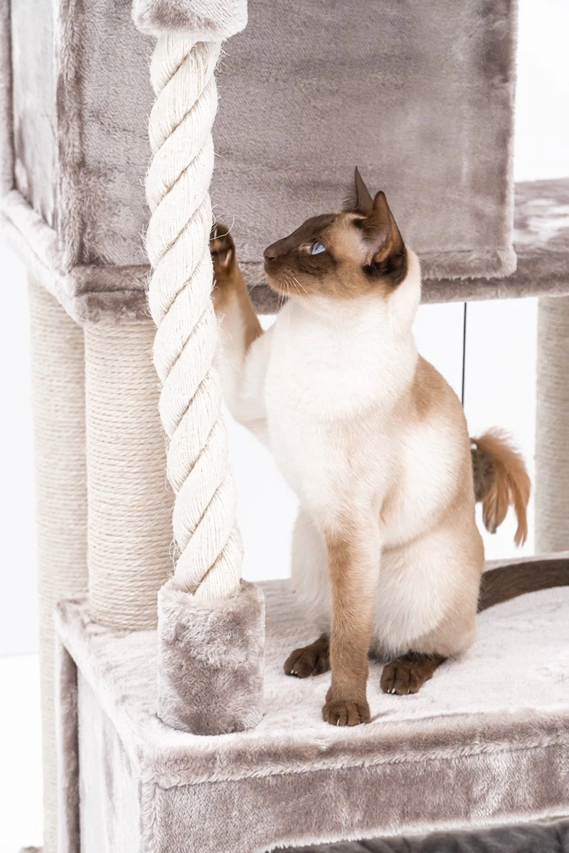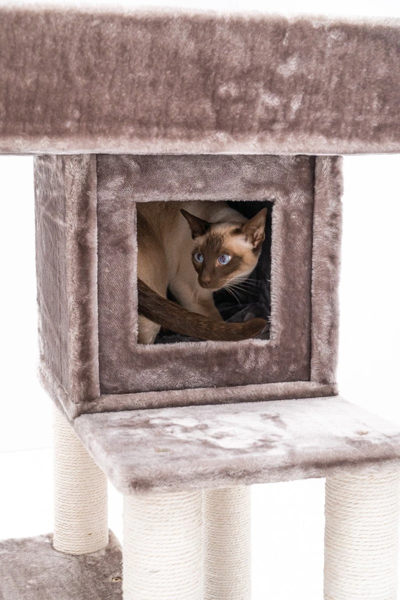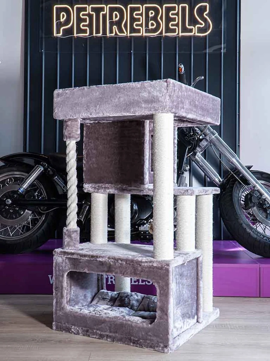 Stoer, stabiel en lekker groot. Onze krabpaal Lodge 107 is een plek waar kittens en kleine katten al hun energie op kwijt kunnen. Aan de dikke krabstammen kunnen ze lekker krabben, maar ze kunnen er ook in klimmen. Helemaal bovenin staat ze namelijk een verrassing te wachten: een supergrote en fluweelzachte loungemand voor een heerlijk schoonheidsslaapje. Maar dat kan natuurlijk ook in een van de twee royale slaaphuisjes.